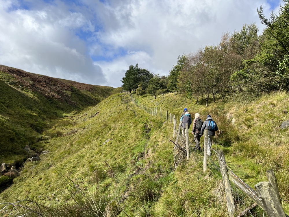 (2) The distinctive stone wall on your left has been proposed as being quite possibly the oldest in the Colne Valley. It is likely to be formed from stone clearance from the creation of the fields above.